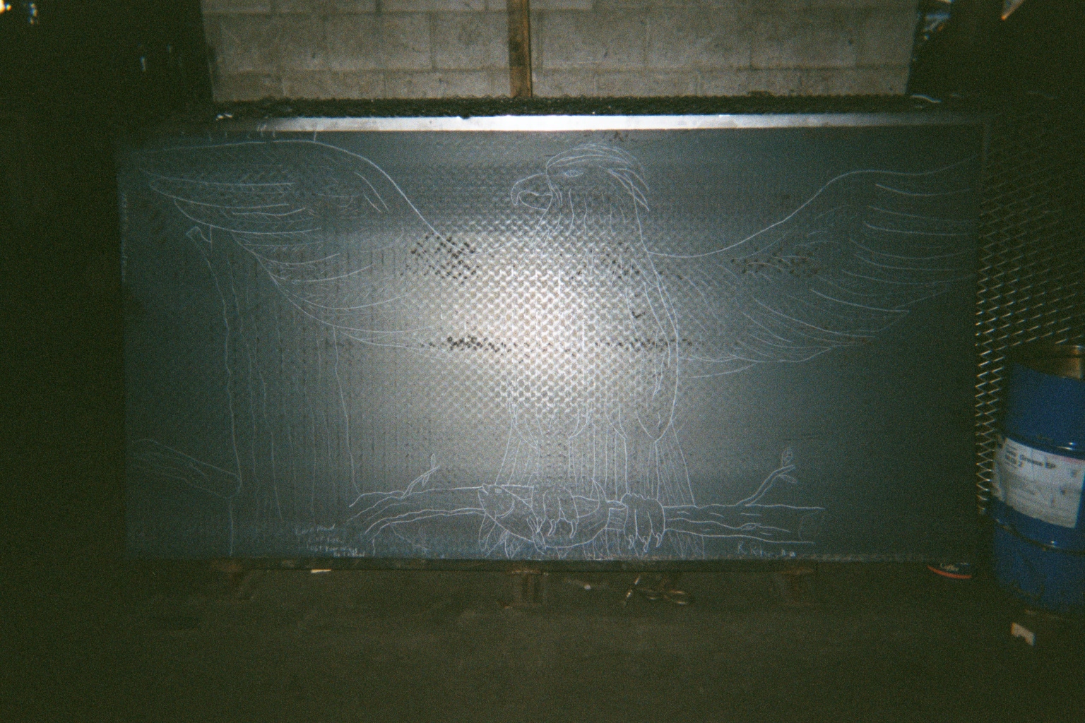 This is what Seville does at work when work is play. I drew this picture while I was on break. It is drawn on a 4' x 8' Steel Floor Plate (Diamond on reverse side) with Soapstone. Caption reads: Live Proud. Fly Free. Lest your wings be clipped. It was really cold that day too.