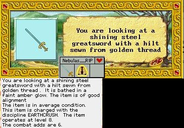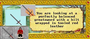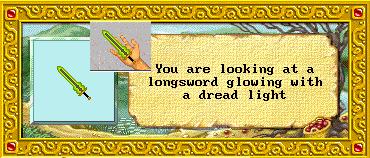 Dread Sword I would KILL for one of these babies. This probably one of the Sweetest sword IMO in the game. It may not be the best but it just ROCKS the way it looks. If I had 30megs I would be willing to buy one just to say I have one. Found in aleria. |