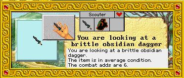 Obsidian Dagger This dagger is found in aleria. From what I understand, its super rare and a thiefs best friend. Does alot of damage when you get BS by it. I have heard rumor of one going for about 15megs but that is just rumor. |