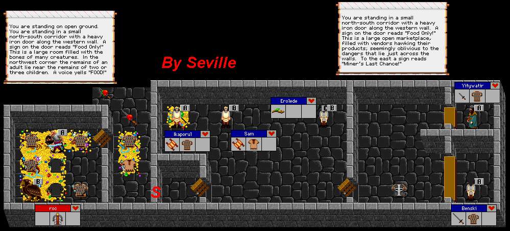 | On Nork -5 in the Haunted area are the Stores and Roc Lair. From the stairs, go east thru the wall and again till you come to a North/South hallway. Go South to get to this area. The Roc Lair is locked, so get a key by trading for it. There is a bank here and a store to sell your gems to. Scroll venders will sell you Succor and other scrolls. |
