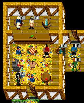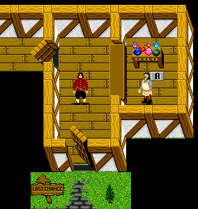 Now, we need a weapon and armor... Eh, with what you have, you can survive only on n-1, "Last Chance", your the first dungeon ever. See that big building northwest of marketplace? Enter it... at the end are stairs. Go downstairs.