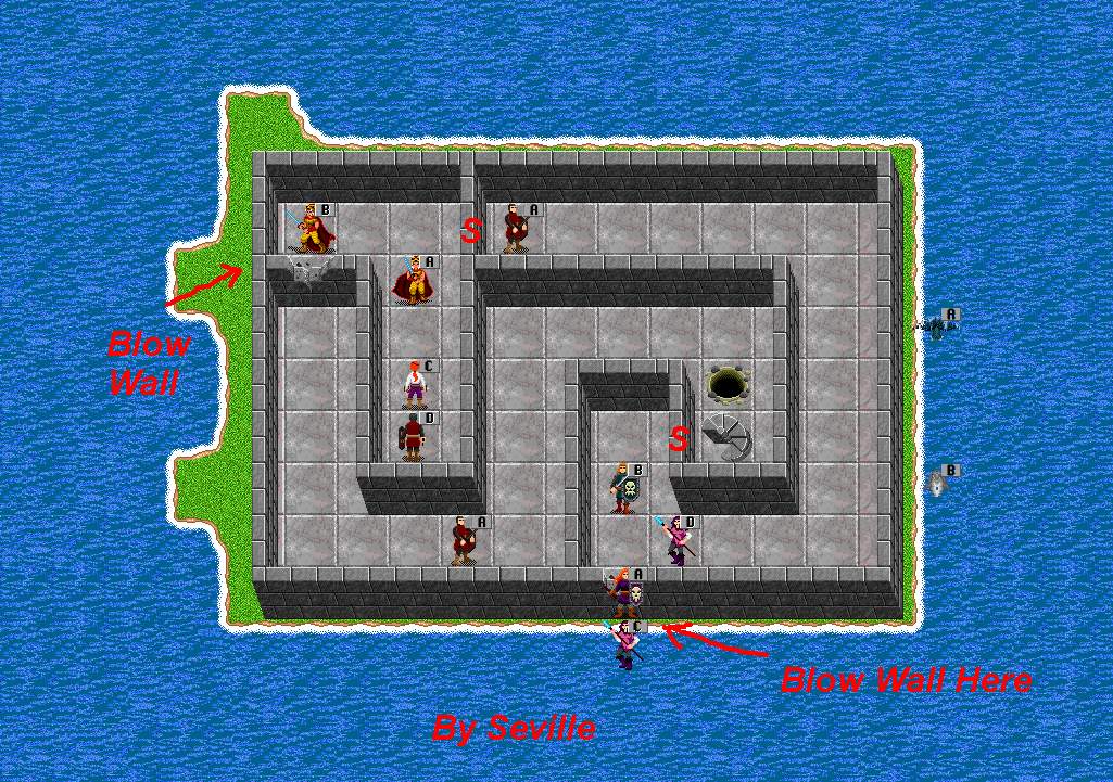 Thanks to Seville's Page South of the Prisons is Guardian Island. Blow the wall to get in. Psi attack, poison and physical attacks are the majority attacks of the crits. Go upstairs to get to the Guardian Lair. Not Recommended for any crit under 18th level. Dropping down hole will lead to lower level of the building.