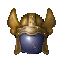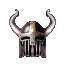 A large helm made of a dull -grey metal with 2 large horns protruding from the crest |