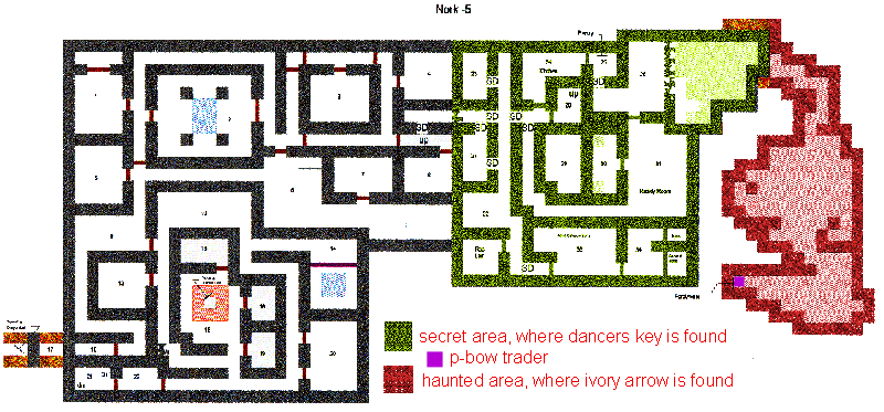 Visit the Fire Room, attack the Red Dragon, buy wares at the store and hunt the Roc for its egg to trade for Poison Bow. Good pot regen area. East side of N -5 is called the Haunted area.