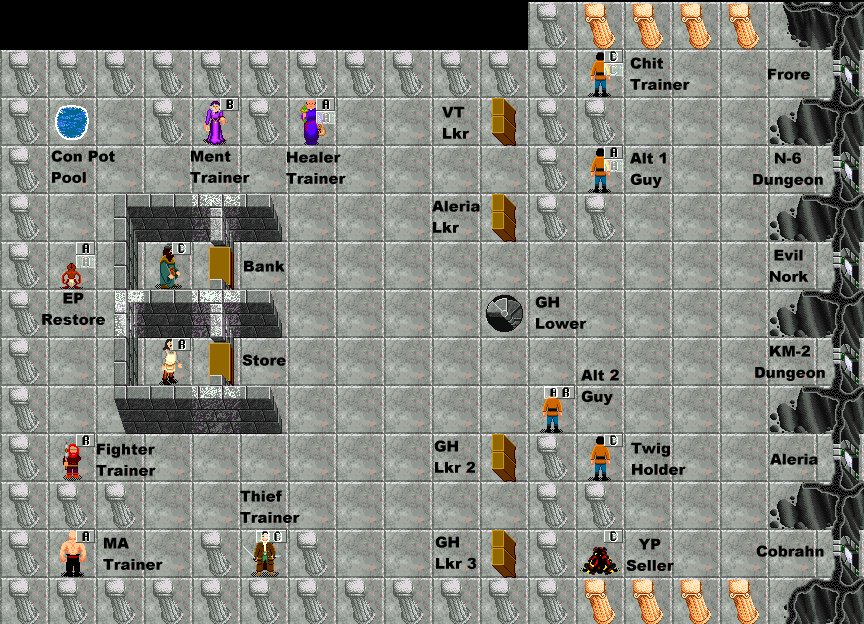 Trainers up to skill 35, with a 20% discount. (still no Barb or Paladin trainer though). You can use the adds to give you added discounts. i.e. Adds enabled + adds clicked + hall discount = 40% discount.